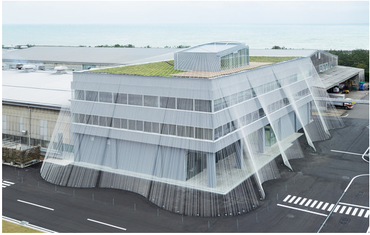 Ο παγκοσμίου φήμης αρχιτέκτονας Kengo Kuma ήταν ο πρώτος που χρησιμοποίησε αυτό το ενισχυτικό υλικό στο σχεδιασμό των κεντρικών γραφείων της Komatsu Seiren . Εξετάστηκε επίσης η χρήση υφασμάτων, μαζί με τα σύνθετα υλικά από ανθρακονήματα, συμπεριλαμβανομένης της «εξαιρετικά λεπτής πορώδους σπογγώδους κεραμικής βάσης 'greenbiz', η οποία είναι ένα οικολογικό δομικό υλικό». Το ολοκληρωμένο κτίριο δεν είναι γνωστό ως το εργαστήριο υφασμάτων «fa-bo».