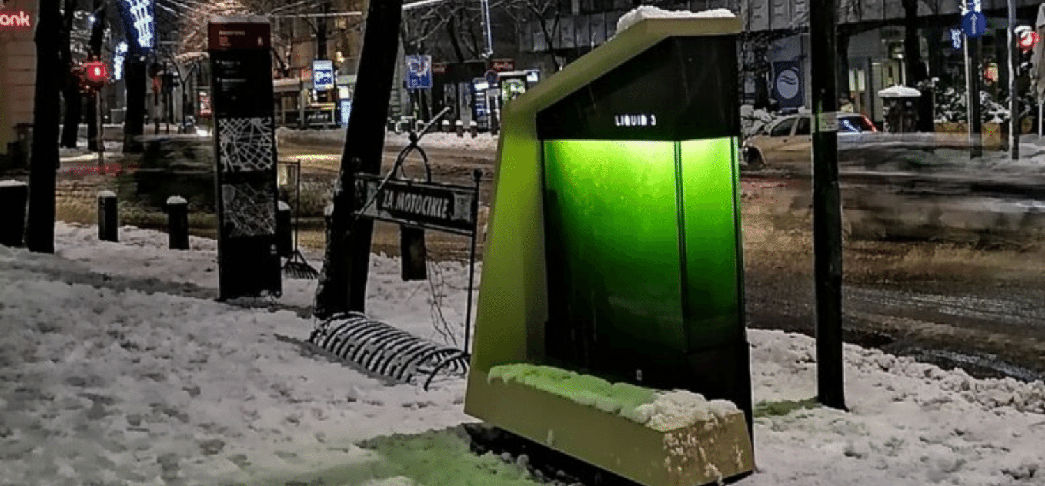 Έναν αστικό φωτο-βιοαντιδραστήρα με μικροφύκη εφηύρε το Ινστιτούτο Πολυεπιστημονικής Έρευνας του Πανεπιστημίου του Βελιγραδίου. Το Liquid 3 καθαρίζει τον αέρα και χρησιμεύει ως πάγκος στο κέντρο της πόλης του Βελιγραδίου. Ο φωτο-βιοαντιδραστήρας Liquid 3 αποτελείται από μια γυάλινη δεξαμενή γεμάτη με 600 λίτρα νερού και μικροφύκη και ένα ηλιακό πάνελ, το οποίο παρέχει ηλεκτρική ενέργεια σε μια μικρή αντλία. Η αντλία φέρνει αέρα στη δεξαμενή μέσω μικροσκοπικών οπών. Τα μικροφύκη εκτελούν φωτοσύνθεση και μετατρέπουν το νερό και το CO2 σε οξυγόνο, το οποίο απελευθερώνεται στην ατμόσφαιρα. Η βιομάζα είναι υποπροϊόν της διαδικασίας. Σε αντίθεση με τα κανονικά δέντρα, η εγκατάσταση απαιτεί περισσότερη συντήρηση. Κάθε μήνα η ποσότητα του νερού με τα μικροφύκη πρέπει να αλλάζει σχεδόν εξ ολοκλήρου και να αφαιρείται η βιομάζα.