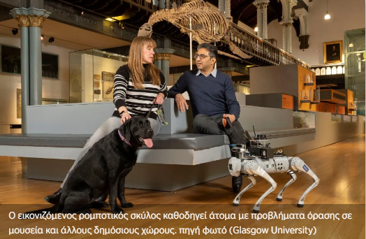 Επιστήμονες του Πανεπιστημίου της Γλασκώβης κατασκεύσαν το RoboGuide, ένα σκύλο ρομπότ με τεχνητή νοημοσύνη που βοηθά άτομα με προβλήματα όρασης να πλοηγούνται σε εσωτερικούς δημόσιους χώρους όπως νοσοκομεία, εμπορικά κέντρα, μουσεία κ.α.