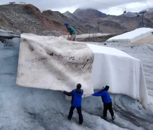 Για να αντιμετωπίσουν το πρόβλημα, πολλά χιονοδρομικά κέντρα σε χώρες όπως η Αυστρία, η Ελβετία και η Ιταλία καλύπτουν εδώ και χρόνια τους παγετώνες τους καλοκαιρινούς μήνες με λευκά γεωυφάσματα. Αυτά τα υφάσματα λειτουργούν σαν «κουβέρτες», αντανακλώντας την ηλιακή ακτινοβολία και επιβραδύνοντας το λιώσιμο του πάγου, διασφαλίζοντας έτσι τη βιωσιμότητα της χειμερινής τουριστικής περιόδου. Ωστόσο, τα περισσότερα από αυτά τα γεωυφάσματα κατασκευάζονται από συνθετικές ίνες, όπως το πολυπροπυλένιο. Έρευνες έχουν δείξει ότι τα συνθετικά γεωυφάσματα, όταν εκτίθενται σε ακραίες καιρικές συνθήκες, απελευθερώνουν μικροπλαστικά. Τα σωματίδια αυτά εντοπίστηκαν όχι μόνο γύρω από παγετώνες, αλλά και σε ρέματα και κοιλάδες χαμηλότερα, μεταφερόμενα από τα νερά τήξης. Έτσι, μια πρακτική που προστατεύει τον τουρισμό και το τοπίο μπορεί ταυτόχρονα να επιβαρύνει τα ευαίσθητα ορεινά οικοσυστήματα και δυνητικά την τροφική αλυσίδα.