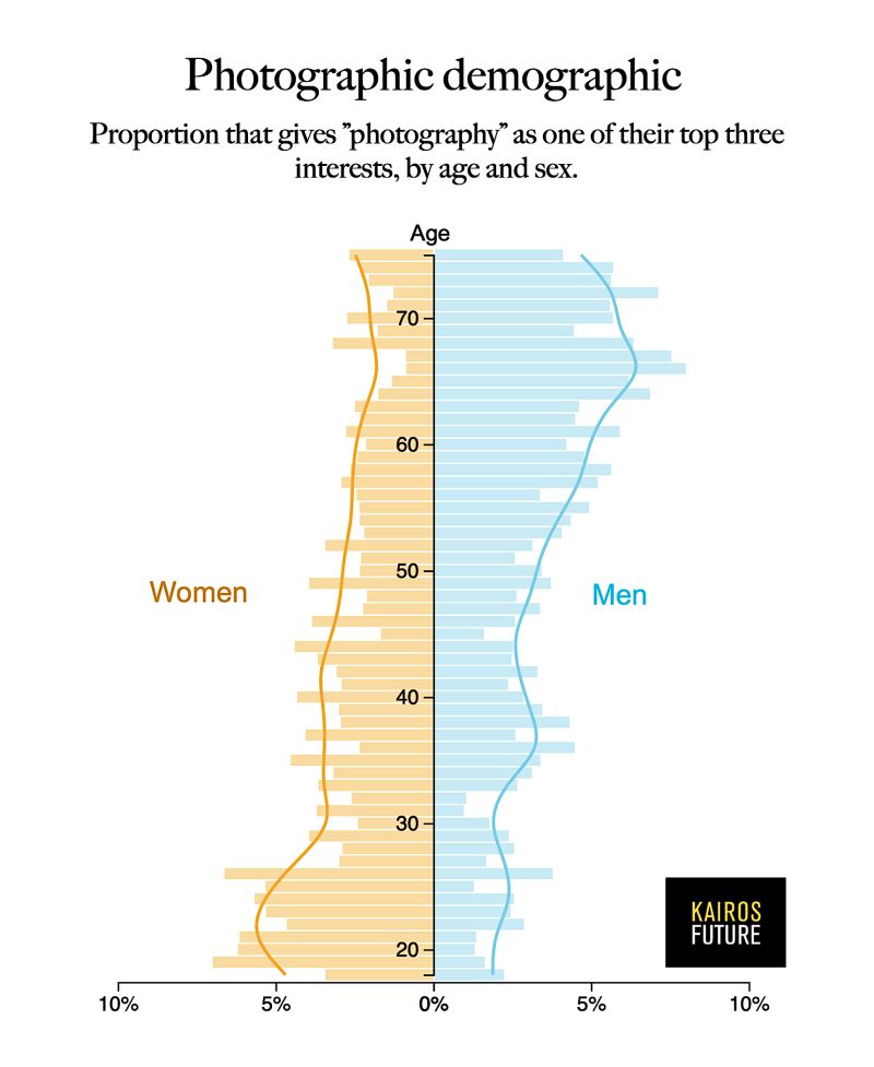 Από την έρευνα προέκυψε ότι η φωτογραφία έχει ένα ασυνήθιστο δημογραφικό προφίλ: το ενδιαφέρον είναι πολύ ομοιόμορφο μεταξύ ανδρών και γυναικών στο σύνολό τους, αλλά τα αντίθετα ηλικιακά προφίλ κάνουν τη φωτογραφία κυρίως δημοφιλή μεταξύ νεαρών γυναικών και ανδρών γύρω από την ηλικία συνταξιοδότησης.