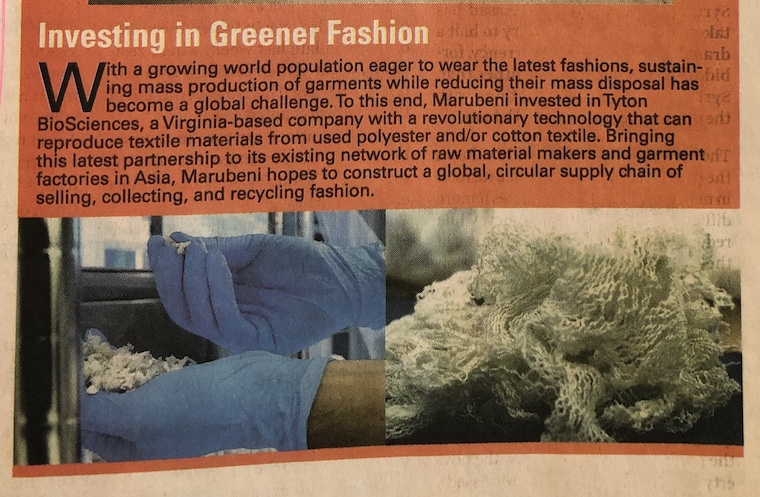 Η ανάγκη για εξοικονόμηση πόρων και η αναζήτηση των καταναλωτών για πράσινα προϊόντα, οδηγεί την τάση των επενδύσεων σε τεχνολογίες ανακύκλωσης υφασμάτων. Η εταιρία Tyton Biosciences (Virginia, USA) χρησιμοποιεί χρησιμοποιημένα βαμβακερά υφάσματα καθώς και υφάσματα από πολυέστερ για την παραγωγή νέων υφασμάτων.