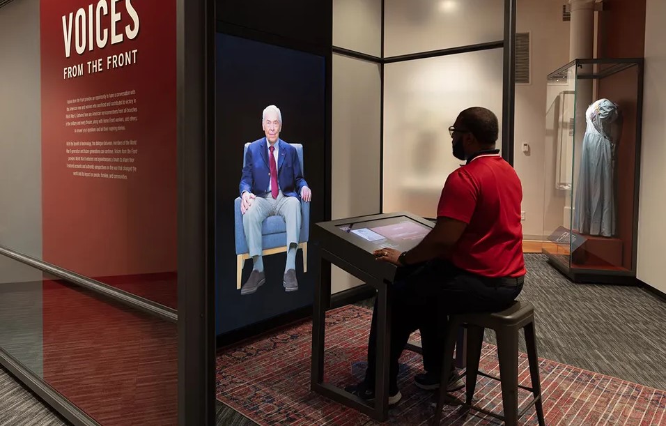 Στο Εθνικό Μουσείο του Β' Παγκοσμίου Πολέμου στη Νέα Ορλεάνη, μια νέα διαδραστική έκθεση χρησιμοποιεί τεχνητή νοημοσύνη για να διευκολύνει τις συνομιλίες με βετεράνους, εργαζόμενους στο εσωτερικό μέτωπο, νοσοκόμες, χορεύτριες της USO και άλλους που συμμετείχαν στην πολεμική προσπάθεια.